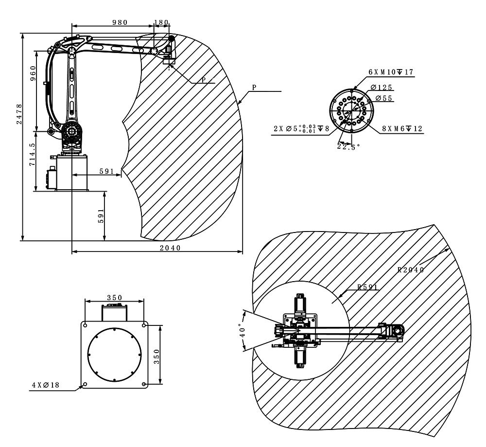 Рабочий радиус 2040 мм дает возможность обслуживать конвейеры, станки и погрузочные зоны в пределах одной рабочей ячейки без дополнительного перемещения основания робота. Это упрощает интеграцию, снижает затраты на модернизацию линии и позволяет грамотно использовать пространство цеха.