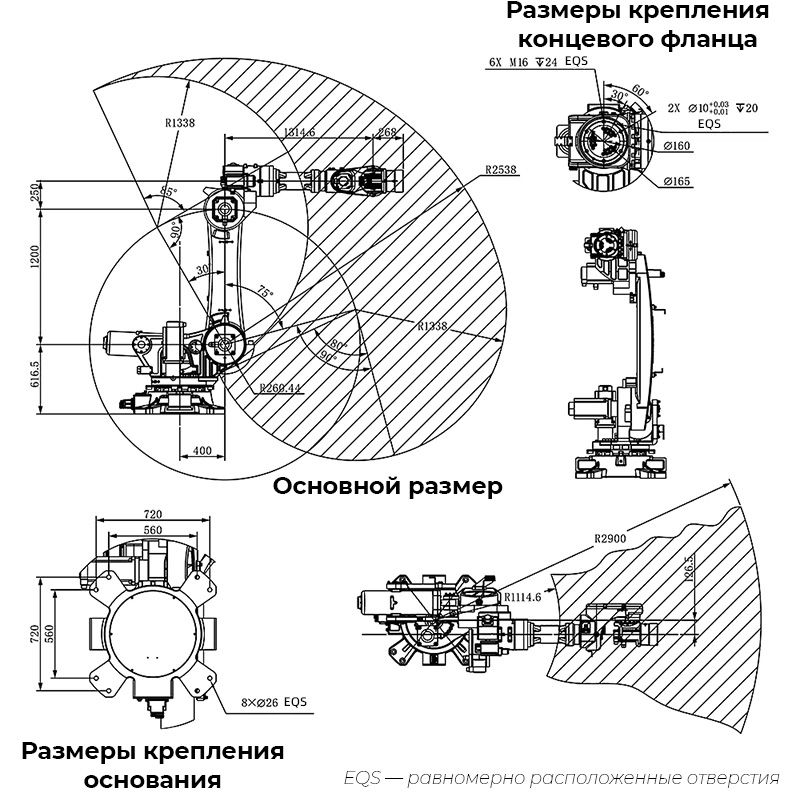 Максимальный размах манипулятора составляет 3168 мм. Такой огромный радиус действия позволяет одной роботизированной ячейке обслуживать сразу несколько производственных станций, станков с ЧПУ или термопластавтоматов. Это значительно упрощает интеграцию робота в существующие линии и позволяет рационально использовать площадь цеха с минимальными перемещениями основания. - Максимальная гибкость