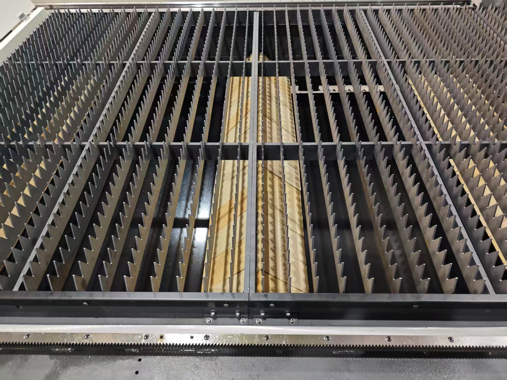 Каркас станка представляет собой массивную конструкцию, сваренную из толстых металлических листов. Внутри полуполой структуры размещены огнестойкие кирпичи, которые защищают внутренние элементы оборудования от воздействия высоких температур, характерных для лазерной резки. Станина устойчива к деформациям и вибрациям, что обеспечивает стабильность точности резки даже при интенсивной эксплуатации. - Чистота в цехе и защита здоровья рабочих